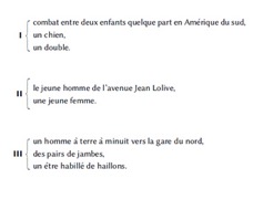 Passées la dédicace puis l’épigraphe, il y a cette page, trois accolades ouvrantes énumérées de I à III, chacune figurant, en deux ou trois vers, une situation. Des scènes ou des repères, des esquisses de tableau, en quelques mots on a croqué trois des situations. Il s’agira de les explorer, de leur donner, dans et par le trait de l’écriture, matière et épaisseur.