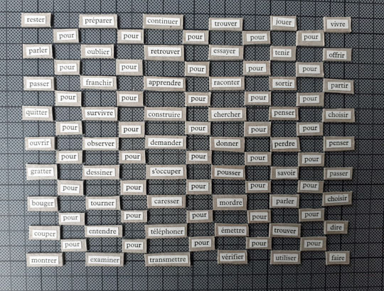 CR : La répétition au départ apparaît comme scansion. Dans les derniers collages depuis 2020, elle vient marteler la langue et rappeler parfois les injonctions langagières que j’évoquais plus haut, celles qui nous sont si violentes, ceci dit je ne prétends pas exercer quelques « pressions sur les consciences » mais plutôt révéler les procédés qui sont à l’œuvre et jouer avec. Une série en cours que j’intitule « Impératif » met clairement ça en exergue. La combinatoire comme multiplication des sens de lecture m’intéresse beaucoup, et si elle paraît simple dans sa facture, c’est parfois ardu à articuler visuellement !