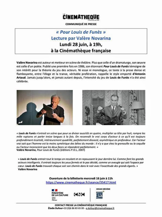 ► Lundi 28 juin à 19H, à La Cinémathèque française : Lecture de « Pour Louis de Funès » par Valère Novarina