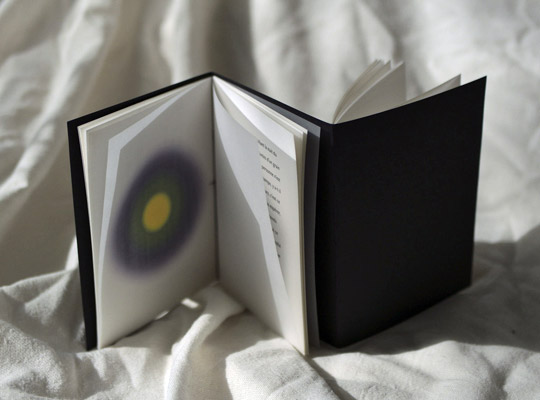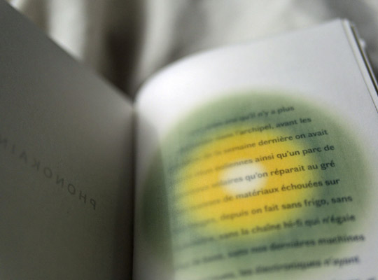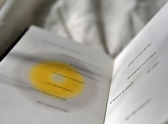 l’impasse consumériste dans laquelle il se fourvoie et planter ses semences dans l’œillet purpuréen de nos pupilles avec la légèreté gravitationnelle d’un papillon illettré. Sous une languette de papier calque, dans le trou noir de la langue, l’œil de Caïn d’un livre nain vous regarde, les mots volent en sons, des miettes de conscience se cherchent, des transparences jouent à cache-cache, dix par treize centimètres de papier à la renverse s’accordéonnent au besoin de sens et de beauté, l’avenir du livre de poésie est un objet d’art non mercantile qui pulvérise les frontières de la lecture et galvanise les sens, d’un coup tiennent entre nos mains l’origine silence de la couleur dans le cocon guerrier de l’univers, le texte et sa recherche, le nouveau s’agrège aux débris de l’ancien pour mieux se reconnaître.