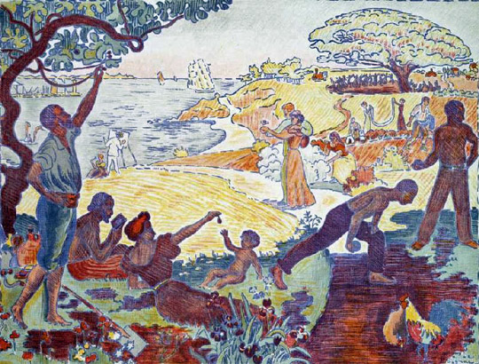Si « pierre de touche » il y a, c’est autour d’une question qui est mienne depuis mes débuts, celle de l’habitation poétique du monde. Ce qui signifie, en allant très vite, que la forme de vie induite par la poésie compte autant pour moi que l’écriture du poème elle-même. Ou encore : au-delà du poème, il y a l’incidence, l’influence souhaitée, d’une Idée poétique (ou plus exactement « poéthique ») que la poésie porte, pour ainsi dire immémorialement, sous la forme d’une aspiration à un âge d’or. Cette Idée consonne selon moi avec la promesse émancipatoire formulée par Marx sous l’appellation d’un « règne de la liberté ». Cette convergence me semble parfaitement illustrée par un tableau de Signac que je commente dans Pastoral, tableau daté de 1895 qui porte pour titre « Au Temps d’Harmonie (L’âge d’or n’est pas dans le passé, il est dans l’avenir) ».