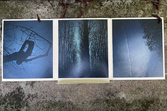 Énigmatiques, trois photographies de Nathalie Postic représentant des arbres au crépuscule entourent (au sens physique puisque le livre est inséré dans ce triptyque d’images) le texte de Samira Negrouche.