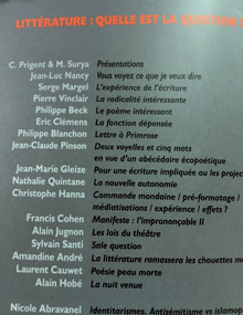 Jean-Luc Nancy | Serge Margel | Pierre Vinclair | Philippe Beck | Éric Clémens | Philippe Blanchon | Jean-Claude Pinson | Jean-Marie Gleize | Nathalie Quintane | Christophe Hanna | Francis Cohen | Alain Jugnon | Sylvain Santi | Amandine André | Laurent Cauwet | Alain Hobé | Christian Prigent | Michel Surya | Nicole Abravanel