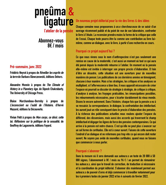 ► On ne manquera pas le lancement d’un projet aussi ambitieux qu’indépendant : La Vie manifeste propose un projet très stimulant, Pneûma & ligature…