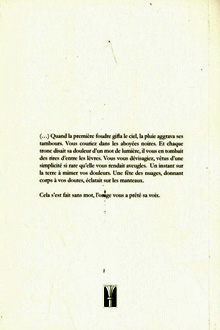 « Tu voudrais t’allonger contre le parquet, te couvrir de ces murs, des traversins gonflés d’oiseaux, comme un faisant battant des ailes, labourant sa peau sur les charpentes de sa chair.»
