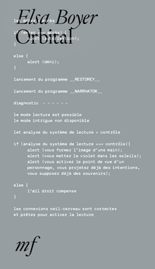 Elsa BOYER, Orbital, éditions MF, coll. « Inventions », novembre 2021, 126 pages, 15 €, ISBN : 978-2-37804-040-6.