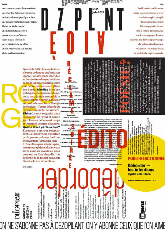 Cette soirée sera l’occasion de présenter le n° 45 de la revue du DeZopilant, « Déborder les impressions » : Numéro réalisé avec Frederika Abbate, Narciso Aksayam, Emmanuel Bauge, Yves Boudier, Cyrille Comnène, Natacha Guiller, Grégory Haleux, Loirelie, Anne Mulpas, Oïm, Jean-Luc Parant, Antoine Robaglia, Chrystel Willemez, Cyrille Zola-Place, Dorothée Zumstein.