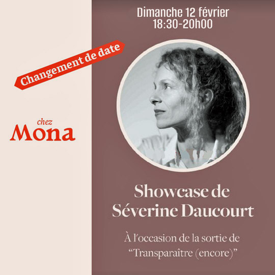 Séverine DAUCOURT, Transparaître (encore), Lanskine, coll. « Les Livres à 5 pattes », en librairie depuis le 9 février 2023, 16 titres (texte + son), 12 €. [Voir « Mature, mature »] Et si vous voulez savoir ce que sont un baladolivre et le spoken pop : ici.