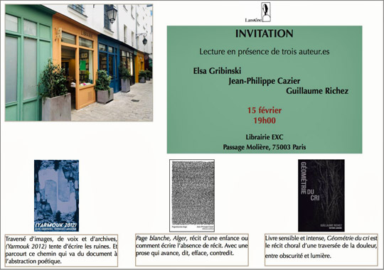 ► Le samedi 18 mars à 19h, à la Maison de la Poésie de Paris : réserver.