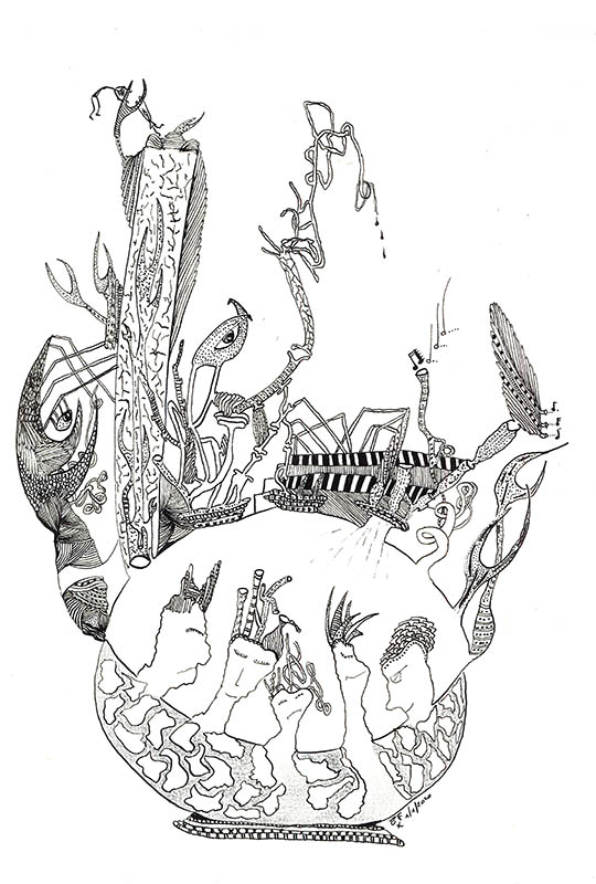 La 2e partie du recueil est un hommage au poète-romancier-compositeur Dominique Preschez ; un dessin médiumnique lui est consacré, ou plutôt à son orgue, que voici :