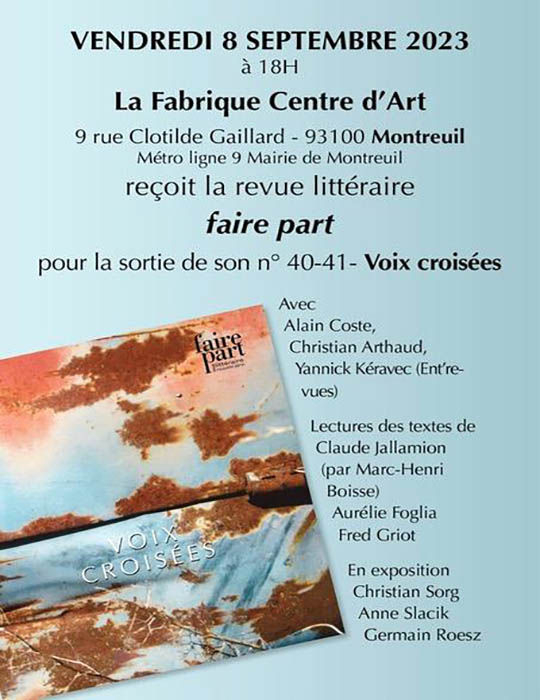 ► Francis COHEN, Conversations avec Anne-Marie Albiach dans l’escalier et État. Une politique de l’imprononçable, Éric Pesty éditeur, été 2023, 126 pages chacun pour 17 €.