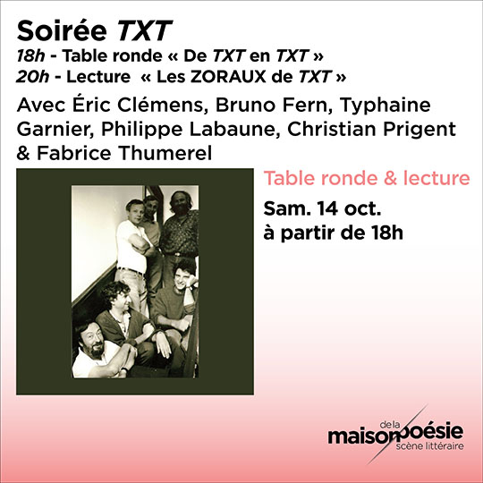 20h – « Les ZORAUX de TXT », lectures de Éric Clémens, Bruno Fern, Typhaine Garnier, Philippe Labaune et Christian Prigent. [réserver]