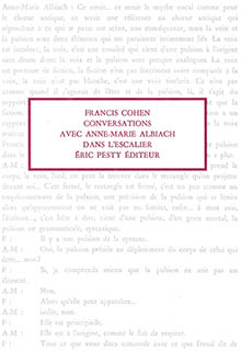 D’emblée, dans son essai l’auteur indique qu’une « lecture politique d’État d’Anne-Marie Albiach est un pari risqué », histoire de poser l’enjeu de ces deux livres à lire en miroir, Conversations avec Anne-Marie Albiach dans l’escalier et État.Une politique de l’imprononçable. La structure du premier est simple, puisqu’elle épouse la chronologie des rencontres de Francis Cohen avec Anne-Marie Albiach, du 18 novembre 2006 au 25 mars 2007 ; les titres sont néanmoins révélateurs : « Le Désaccord », « La Pulsion », « L’attribut », les trois lectures d’État (« Prise au dépourvu », « Le Thème ne pourrait jamais arriver » et « Les Lisières de la logique »). Quant à celle de l’essai, elle oscille entre citations/commentaires (de Lautréamont, Maurice Blanchot, Jean Daive), extraits des entretiens et entrées diverses, dont « Du loyaume », « La Loi(e) d’une méthode », « Le Corps marchandise », « L’Utopie de l’inépuisable roman », etc.