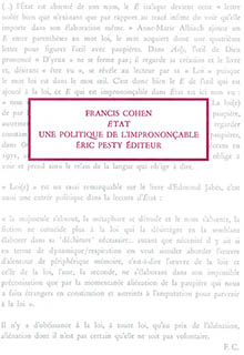 D’État il sera question, et même du « plan de sa mise à mort », étape indispensable pour aborder les autres livres, que ce succès initial éclipsait. Ce grand-œuvre Francis Cohen le connaît bien, lui qui l’a encore étudié récemment dans un article du n° 62 de Lignes (printemps 2020), intitulé « L’Imprononçable : une politique » : l’imprononçable État, il avait souhaité en proposer une lecture juxtalinéaire en regard de l’imprononçable LOI(E), qu’Anne-Marie Albiach avait publié dans le numéro 23 de ChangeMonstre poésie », été 1975), en écho à Aely d’Edmond Jabès. En vain : « Il n’y a que des digressions par rapport à l’œuvre de Jabès, il n’y a pas de point de vue critique. En ce qui concerne la logique, c’est pareil. » Quels que soient les sujets et notions abordés (thèmes du miroir, de la pulsion, de la perte, de l’attribut, et même du rire) les logiques de la poète et de l’écrivain-philosophe demeurent fondamentalement parallèles : nulle véritable convergence possible. L’un se fonde sur des définitions conceptuelles, se réfère à Freud ou Bataille, va même jusqu’à poser ce genre de question : « le présent élevé au carré, c’est l’éternité quatre ? » ; l’autre invoque le « savoir dévié », le « savoir inné », les « lisières de la logique ».