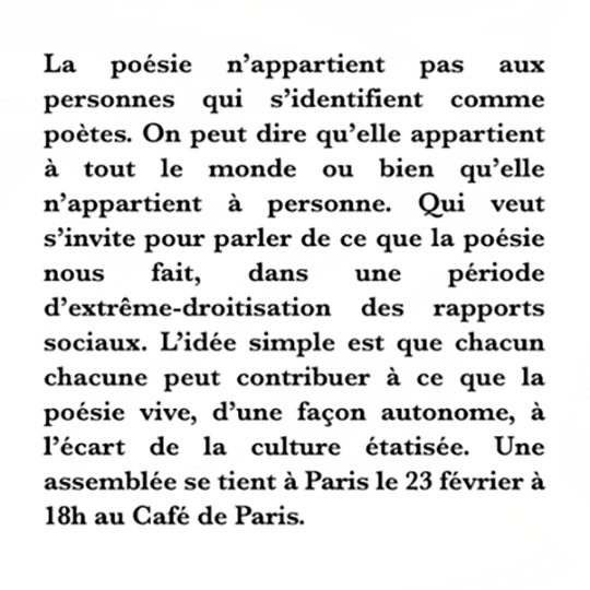 Un appel est donc lancé, avec AG diverses (dont celle de Paris ci-dessous), à toutes celles et tous ceux qui souhaitent s’unir contre une conception vieillotte de la poésie consubstantielle à un mouvement réactionnaire mainstream.