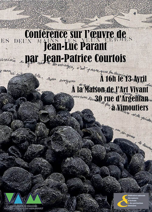Au programme : Exposition (15h), conférence de Jean-Patrice Courtois sur Jean-Luc Parant 16h), visite de son atelier (17h) et cocktail (18h).