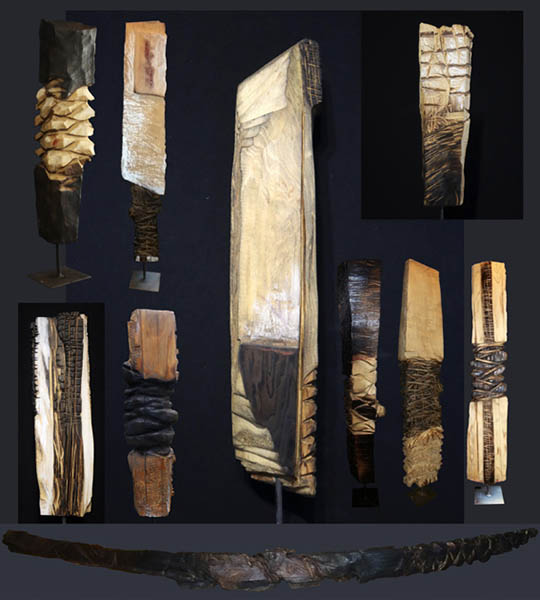 Penser est un travail de la main (Heidegger), la main offre et reçoit, elle trace des signes et ceux qui apparaissent sur les bois brûlés de Marc Simon relèvent d’une délicate précision, dans le souci des détails, accentué par des stries et des crêtes lumineuses jusqu’au brûlage sombre qui s’élève et suinte. Toutes interprétations symboliques me semblent réduire le pouvoir de fascination d’une œuvre. Donner un sens précis et littéraire réduit le polymorphisme de la matière qui est travaillée, transcendée. Une œuvre peut être parfaite et impure, impure donc parfaite, dans le sens où, monumentale, elle agit par répétitions, rejets, augmentations, à travers prises, reprises et sur-prises, qui mêlent des strates et composent avec des dimensions et des couleurs multiples, formant des séries en appelant d’autres, et cela, dans un jeu infini où maitrise, hypothèse de l’inconscient et hasard relancent les dés. L’art ici comme conscience et sensation multipliées.