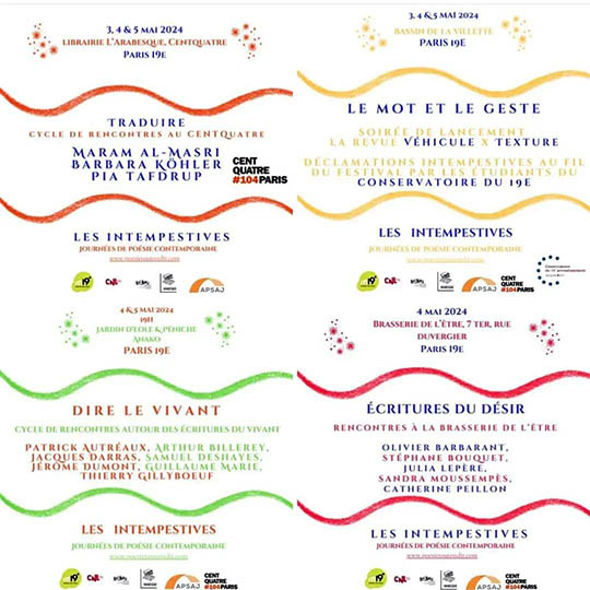 ► Lundi 29 avril 2024 à 20H30, Maison de la poésie Paris, salle Pierre Seghers : Patrick Beurard-Valdoye et Nicolas Pesquès, « Intégrales au long cours » (réserver : attention, la séance de lectures est bien à 20H30 et non à 19H30 comme indiqué sur la page de réservation).