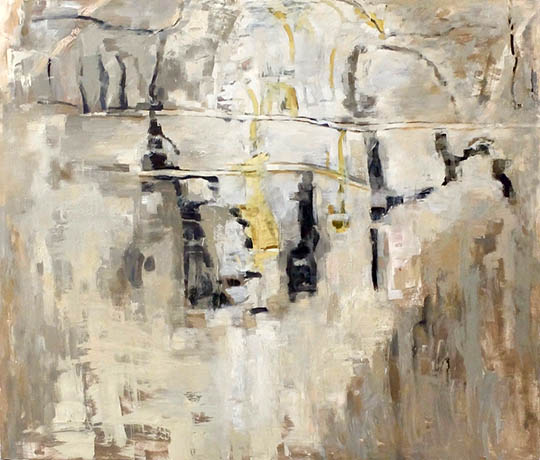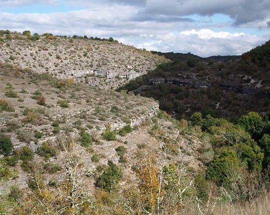 justement. Et Job découvre alors celle-ci avec le regard d’un nouveau-né. Telle serait la révélation (ou la rédemption), une connaissance du monde avant les noms ; la connaissance par les noms appartient à la chute de l’homme dans le temps. Job regarde le monde et la création du monde avec un œil neuf, c’est du moins ce que Yahvé enseigne à Job en l’interrogeant, mais n’est-ce pas ainsi, sous l’angle de la révélation et de la rédemption, que Miklos Bokor peint ses paysages ? Avant de peindre des paysages (ceux du Lot, en particulier), Miklos Bokor a effectué pendant ses deux années à Berlin (1974-1975) une série de trente et un dessins au bistre et au sable intitulée « Job », qu’il convient d’ajouter aux séries de dessins au bistre du Délire de l’homme. Nous reprîmes un peu plus tard notre conversation à propos de Job et la peinture : « Vous comprenez, il faut laisser le mystère, ne pas détruire le mystère qui est le sens de la révélation. Tout ce qui dévoile ou explique (la connaissance par les noms) n’est que la négation du mystère et par conséquent ne révèle rien. » Le lendemain matin (18 août), un violent orage de grêle éclata, déchirant les feuillages, saccageant les branches des noyers tombées à terre, les vignes abattues, les raisins arrachés et perdus à coup sûr. Il faut savoir que « Bokor » signifie arbuste en finno-ougrien (langue hongroise). L’après-midi je me rendis en voiture au gouffre de Cabouy, puis je continuai par un chemin de terre qui tourne au-dessus de la vallée de l’Ouysse pour rejoindre la route de Calès. À cet endroit les parois rocheuses proviennent d’anciennes couches de lave qui sont restées en suspension au-dessus de la vallée. Entre les Causses comme des mamelons, les combes sont désertiques et arides, sauf lorsqu’une source souterraine circule dans l’une d’elles. Subitement, elle se pare d’une coulée verte qui contraste avec la couleur grise de la pierre.