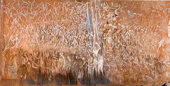 Par la suite, il y eut bien d’autres rencontres, notamment à Paris, dans l’atelier que Miklos Bokor occupait à La Ruche. Je regrette de n’en avoir pas retenu le décompte, et surtout le détail de nos conversations, comme je le faisais lorsque nous étions dans le Causse. L’hospitalité de Miklos se limitait souvent à une galette de pain azyme et un verre d’eau, que j’acceptais volontiers, car j’y voyais soudain le visage de la privation. Nous parlions beaucoup de l’histoire, du nazisme et du stalinisme, mais aussi de la « Solution finale ». Dans nos conversations, il y avait surtout de longs silences que ni l’un ni l’autre ne cherchaient à remplir. Le silence allait de soi, il était même le principal contenu de notre dialogue, surtout quand il me montrait ses derniers tableaux. D’ailleurs il restait silencieux tout ce temps. Quand l’un de nous deux prenait la parole, celle-ci coupait au vif le silence. Nous éprouvions une fascination commune pour la peinture d’El Greco, fascination très visible et reconnaissable dans la peinture de Miklos. Au printemps 1987, je passai deux semaines à Tolède, au cours desquelles je lisais les œuvres de Novalis, en vue d’écrire un essai. Mais surtout, je consacrais mes après-midis à rechercher et à voir les tableaux d’El Greco qui sont dispersés dans les recoins de la ville. L’impression de terreur ou d’effroi, les ciels déchirés par les éclairs au milieu de nuages sombres, la lutte entre la lumière et l’ombre, étaient bien ceux que je retrouvais dans les derniers tableaux de Miklos Bokor, qui n’avaient plus rien de ressemblant avec les tableaux de paysages du Lot que j’avais connus en premier. Pour Miklos Bokor, El Greco était le peintre suprême, même s’il n’allait pas jusqu’à le placer au-dessus de Rembrandt, mais quelle que soit son admiration pour la plupart des grands peintres, je sentais bien que El Greco était son préféré, et je crois que cela se ressent encore davantage dans ses tout derniers tableaux et les fresques sur les murs de Maraden. La peinture de Miklos Bokor s’est retournée progressivement à partir de l’année 1988, et sans doute à partir de cette période où nous nous nous sommes rencontrés. De la peinture claire (pintura chiara) des paysages du Lot, dans lesquelles aucune figure humaine n’apparaissait, Miklos Bokor était passé à la peinture obscure (pintura obscura), lorsque « l’homme est revenu dans sa peinture », comme il me l’annonça d’une voix presque tonitruante dans son atelier de La Ruche. J’aimerais faire revivre une expérience assez étonnante, lorsque je rendis visite à Miklos Bokor dans son atelier à la Ruche, au premier étage, auquel on accédait par un escalier sous une charpente en bois, c’était au début de l’automne 1988, le 23 septembre. Miklos avait laissé sa porte ouverte : dans l’entrée, il y avait un grand tableau peint sur toile auquel il finissait de travailler, et qui n’était autre que Les Diablerets, dont il avait commencé à peindre en Suisse plusieurs esquisses. Nous avions échangé d’assez brèves effusions en manière de salutation, lorsque tout de suite il prononça cette phrase, que je trouvais annonciatrice de salut : « — Gilles, l’homme est revenu dans ma peinture ! » Revenu au sens de réapparu, homme au sens de figure humaine, portrait… Or, en regardant Les Diablerets, je ne trouvais aucune trace de présence humaine, bien au contraire j’y voyais un paysage alpestre, quasi géométrique avec un immense triangle isocèle inversé, dont la pointe était tournée vers en bas, au sens littéral du mot « catastrophe », et qui me faisait penser plutôt à l’Enfer de Dante, mais un enfer sans aucune présence humaine. Au fond de moi, je ne doutais pas que Miklos Bokor avait eu le sentiment de retrouver l’homme en peignant ce tableau sans la figure de l’homme, mais dans le sens où celle-ci était encore cachée par l’intention. L’homme allait réapparaître. Et il était réapparu, en effet. Car quelque temps après, j’ai découvert que Miklos avait peint un tableau similaire, en 1987, c’est-à-dire un an avant Les Diablerets, intitulé Le Dernier Jugement, lequel reproduisait au détail près la forme géométrique des Diablerets, un triangle isocèle inversé dont la pointe est tournée vers en bas, mais cette fois avec des figures anthropoïdes, des formes blanches suspendues dans le paysage. Si le tableau ne s’était intitulé Le Dernier Jugement, on aurait pu y deviner en effet les figures de damnés descendant vers l’Enfer. Hormis qu’il ne s’agissait plus de damnés, mais de déportés, et que l’enfer n’y était pas celui de Dante, mais l’enfer des camps d’extermination. Le Dernier Jugement n’était pas « le jugement dernier », puisqu’il retrouvait l’humanité, et pas seulement le peuple juif, prise dans l’horreur et l’atrocité des camps d’extermination. Or, ce jour-là, le seul tableau qu’il me montra était celui des Diablerets, au demeurant d’une beauté inoubliable, et au fond duquel je recherchais en vain la figure de l’homme dans le paysage. Il ne fallait pas seulement avoir des yeux, mais il fallait avoir l’intelligence du peintre pour comprendre que l’homme était réapparu dans ce tableau. L’homme, en effet, n’avait plus qu’à réapparaître. Je retrouvais Miklos Bokor, que je n’avais pas revu depuis quatre ans, au cours de l’été 2002, le 20 juillet, devant l’église désaffectée de Maraden où il m’attendait, à dix heures du matin, sur le parvis de la porte : c’est alors que je découvris, pour la première fois, « La spirale de l’histoire », une fresque incommensurable qui recouvrait tous les murs de l’église jusqu’à une hauteur considérable. Dire ce que j’ai retenu de cette première visite aurait peu d’intérêt. L’injonction était brève : ne dire que ce que je voy