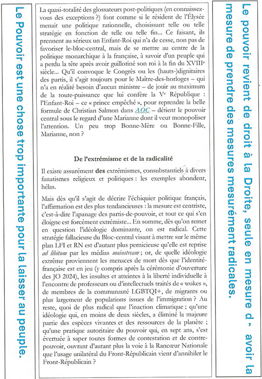 * Christian Salmon, « Macron, prince empêché », AOC, lundi 26 août 2024.