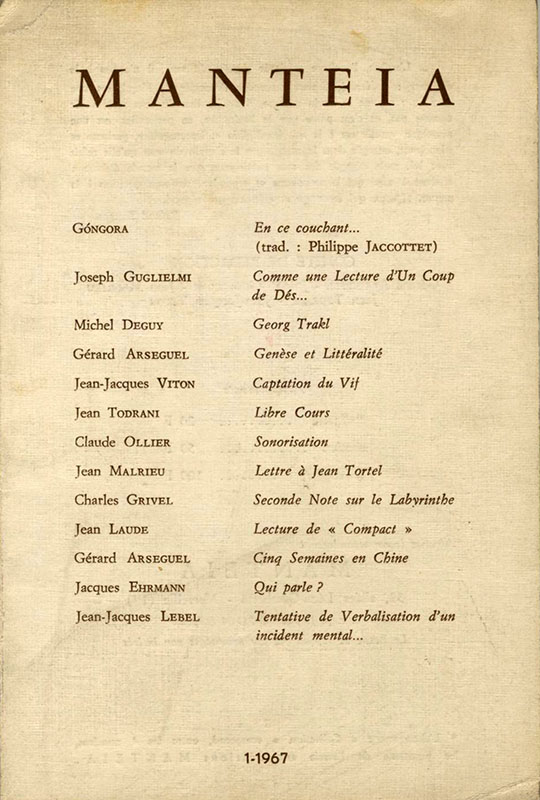 Avec ce volume les exigeantes éditions METTRAY ont commencé à publier les œuvres complètes de Gérard Arseguel (1938-2020), plus précisément de ses textes parus en revues ou dans les premiers recueils, ici présentés dans l’ordre chronologique. Dans sa passionnante préface, Catherine Soulier rappelle qu’avec d’autres écrivains (Jean Todrani, Joseph Guglielmi, Jean-Jacques Viton et Jean Malrieu) il anima de 1963 à 1974 la revue Manteia, au cours d’une époque de foisonnement théorique mêlant étroitement littérature et politique.