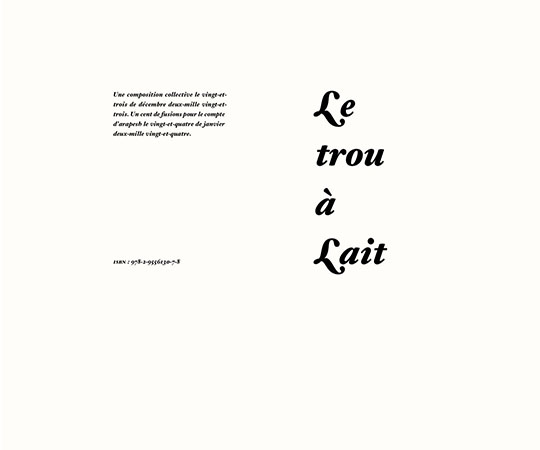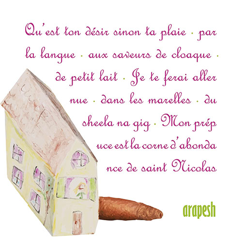 Dans la lignée des OLNI quasi mallarméens qui « arrachent » et qu’Arapesh commet sans sourciller à l’adresse des initiés qui se reconnaissent, voici donc deux tirages originaux qui, réunis sous une même jaquette, émettent des éclairs de sens à l’avant-garde de la lisibilité grâce auxquels les affres de la chair croisent les gemmes d’un au-delà génital de la Recherche, le plomb s’alchimise en or, la violence tutoie le sacré, Éros et Thanatos dans un tantra d’extrêmes cohabitent, soufflant le chaud & le froid, poussant loin l’exigence le style & le projet, brisant borderline so Sade les conventions : le premier – en apéritif le téton en prime la sardine, « À charge de mot l’anus » -, « Le trou à lait », une performance pluridisciplinaire cousue de clins d’œil vidéo-cryptés – sorte de tournante subliminale des états d’âme du corps régurgitant le vécu – annonce sans ambages la couleur,