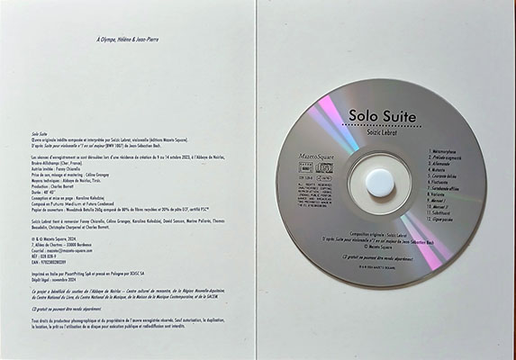 Solo suite, Soizic Lebrat au violoncelle, texte de Fanny Chiarello, livre-CD, Mazeto square, en vente depuis le 22 novembre 2024, 20 €, ISBN : 978-2-38028-028-9.