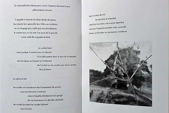 Déroutant au début, le texte dévoile ensuite toute sa subtilité : en fait, « Bach est un prétexte pour aller ailleurs »… (D’autant plus que la violoncelliste a trouvé sa voie grâce à Joëlle Léandre, au cours d’un master class où elle s’est lancée yeux fermés dans l’improvisation). Et toutes deux, Soizic et Fanny, sont en quête d’ « un lieu secret », musical ou géographique. Pour ce qui est de la poétesse, ses lignes de fuite, parallèles aux « lignes taillées au fil de l’archet », l’entraînent loin de toute tradition, mais paradoxalement lui font suivre un mouvement centripète : sa poésie spatiale et musicale tracent « les lignes de désir » qui la conduisent à rechercher les divers centres géographiques de l’hexagone, et par glissando de la borne marquant le centre de la France à la partition de Bach…