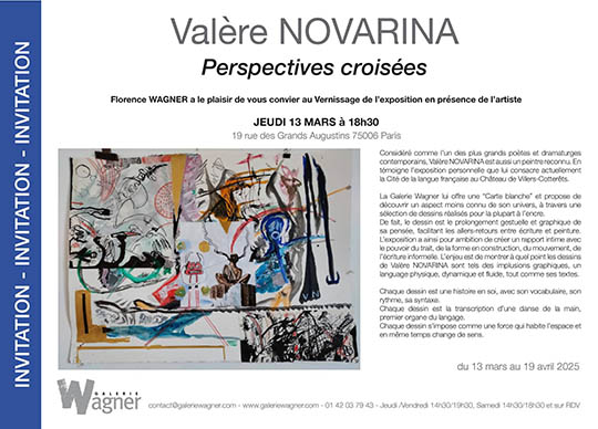 En plus de l’exposition « Traces d’écriture, peintures, renversement… », que l’on peut et doit visiter jusqu’au 27 avril prochain à la Cité internationale de la langue française (château de Villers-Cotterets), RV jeudi prochain à la Galerie Wagner pour une exposition complémentaire d’une trentaine de dessins : « Perspectives croisées »…
